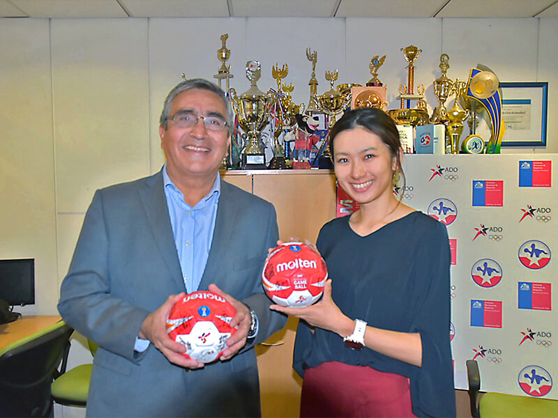 私の母校の後輩たちを中心に集めてくれた、日本で会おうよメッセージ入りの中古ハンドボールと、22年ぶりに日本で開かれる女子ハンドボール世界選手権大会in熊本出場予定のおりひめジャパンの選手たちのメッセージの入った公式球を、チリのナショナルトレーニングセンターに伺って、チリ・ハンドボール協会会長と女子チリ代表に寄贈しました。