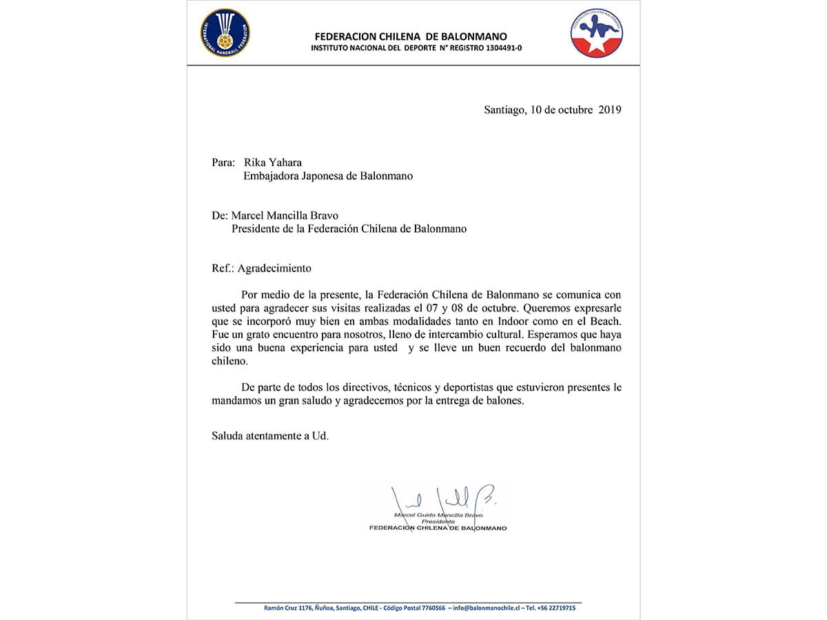 サンチャゴ日本人学校のお友だちからお礼状をいただきました。また、チリハンドボール協会マルセル・マンシージャ(Marcel Mancilla)会長より日チリハンドボール友好への貢献への感謝状をいただきました。ありがとうございました!